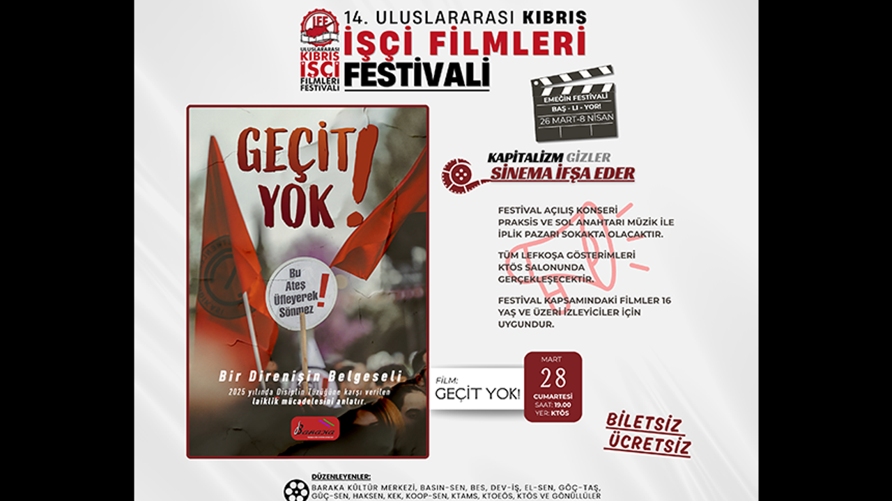 Festivalde, yarın akşam saat 19.00’da Kıbrıs Türk Öğretmenler Sendikası Salonunda “Geçit Yok!” filmi gösterilecek. “Geçit Yok!” filmi, geçen yıl iki öğretmen sendikasının öncülüğünde “Disiplin Tüzüğü”ne karşı yükselen direnişi anlatıyor.