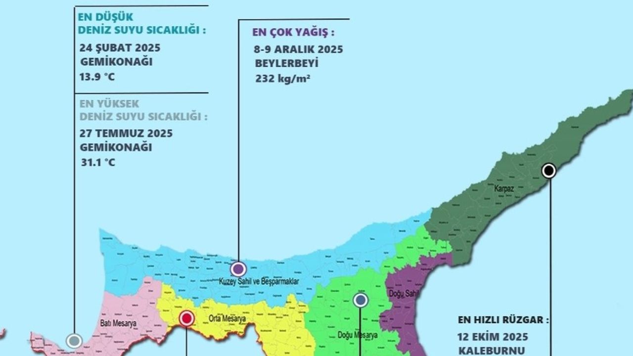 Hava sıcaklığının -6.2 derece olduğu 25 Şubat en soğuk gün, hava sıcaklığının 46.2 derece olduğu 13 Ağustos ise en sıcak gün olarak açıklandı. En soğuk gün Geçitkale’de, en sıcak gün ise Türkeli’de yaşandı.