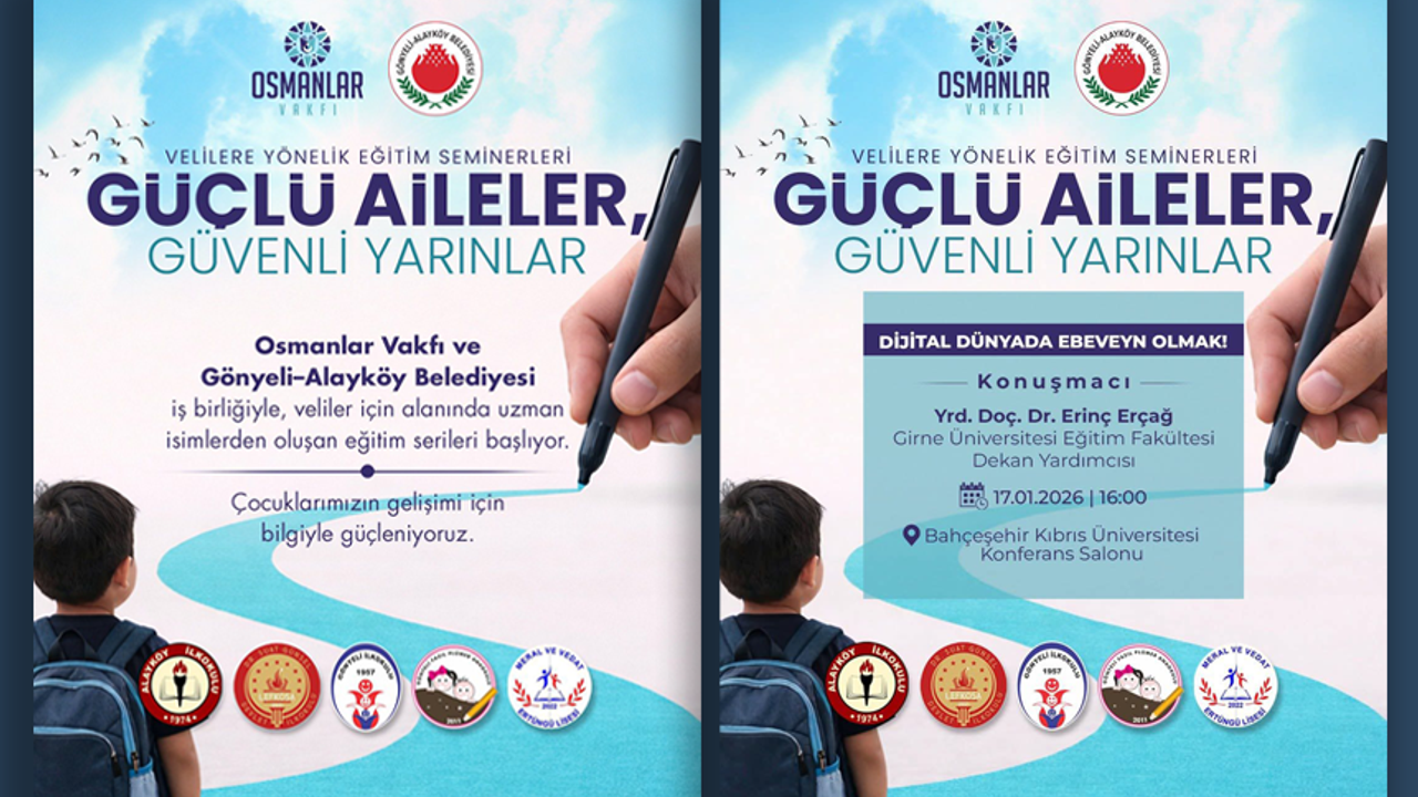 Osmanlar Vakfı ile Gönyeli–Alayköy Belediyesi iş birliğinde, bölge okullarımızın katkılarıyla hayata geçirilen “Güçlü Aileler, Güvenli Yarınlar” başlıklı velilere yönelik eğitim seminerleri başlıyor.