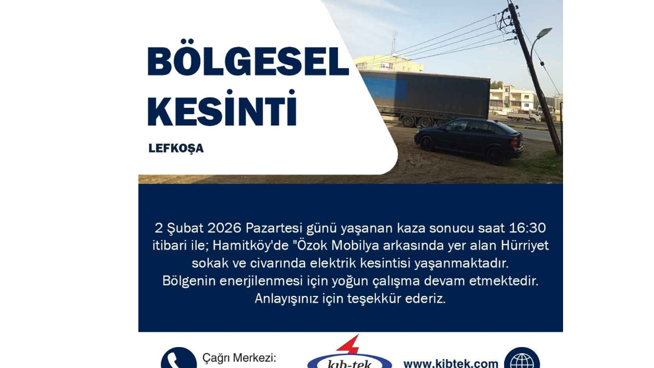 KIB-TEK, trafik kazası nedeniyle Hamitköy’de elektrik kesintisi meydana geldiğini duyurdu; arızanın giderilmesi için çalışmaların devam ettiği vurgulandı.