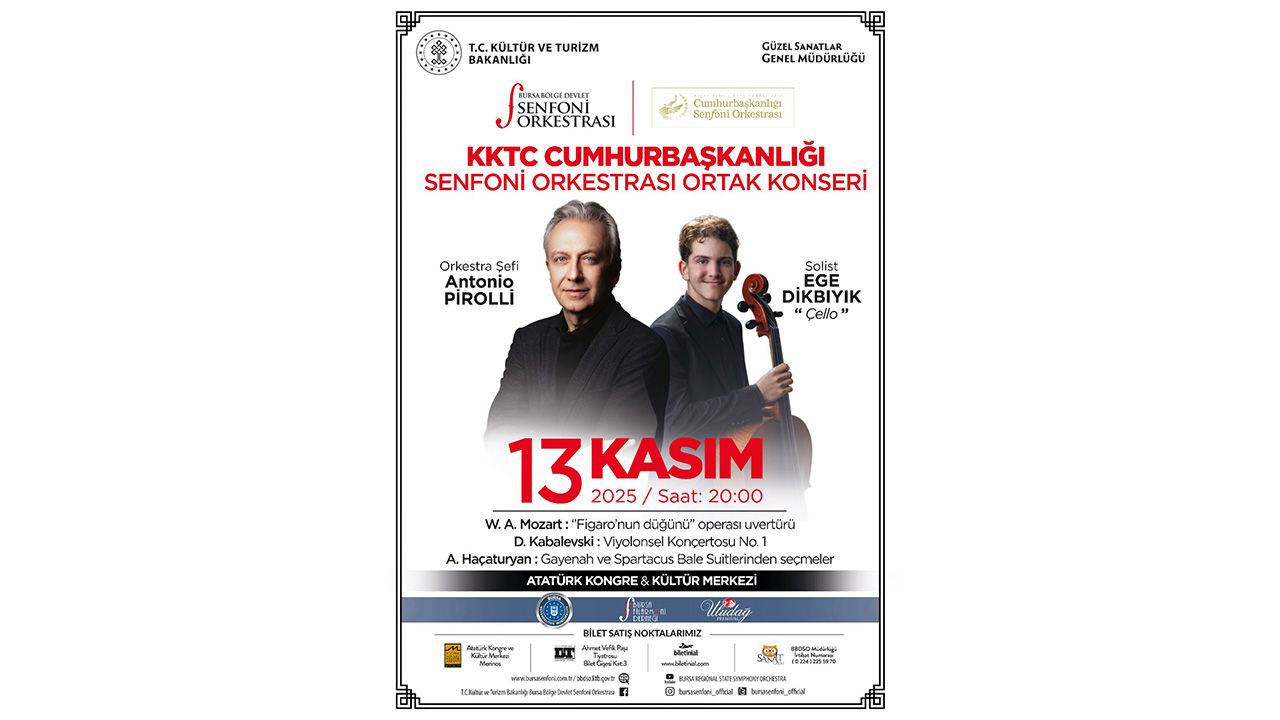 Cumhurbaşkanlığı Senfoni Orkestrası (KKTC CSO), 13 Kasım Perşembe günü Bursa’da sahne alacak.