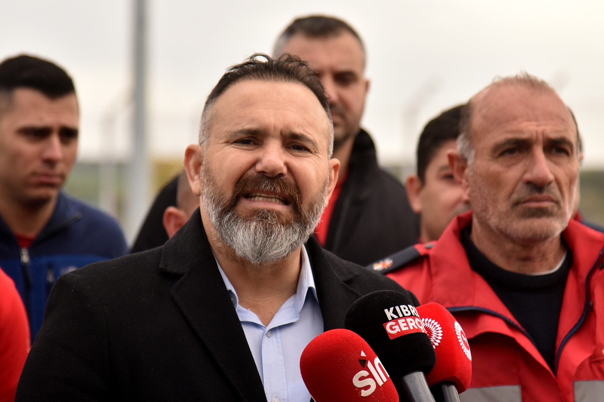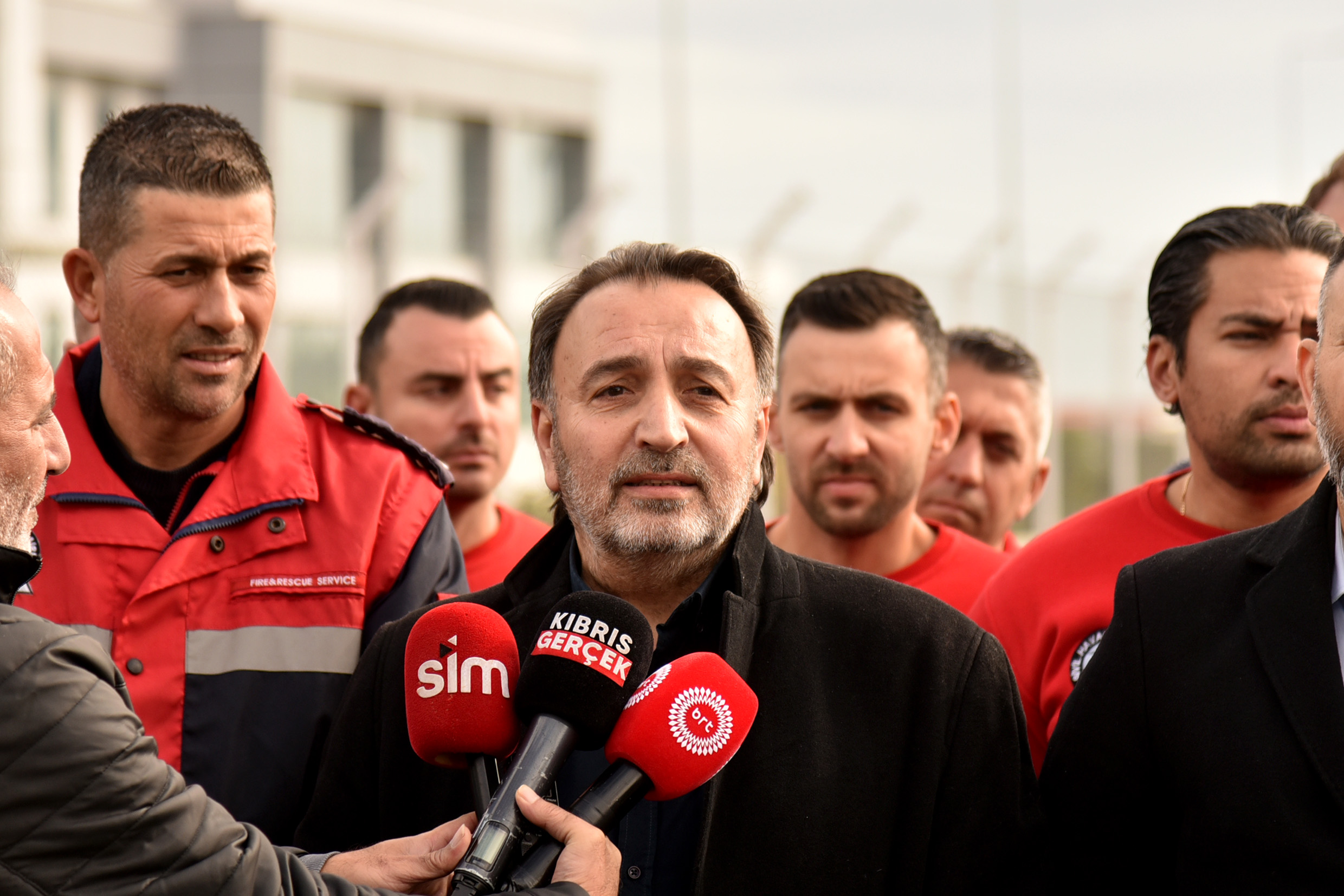 Kıbrıs Türk Amme Memurları Sendikası (KTAMS) Genel Başkanı Güven Bengihan ve Kıbrıs Türk Kamu Görevlileri Sendikası (KAMUSEN) Genel Başkanı Metin Atan, Ercan Havaalanı İtfaiye Birimi önünde, birimdeki eksiklikler ve sorunlarla ilgili basın açıklaması yaptı.