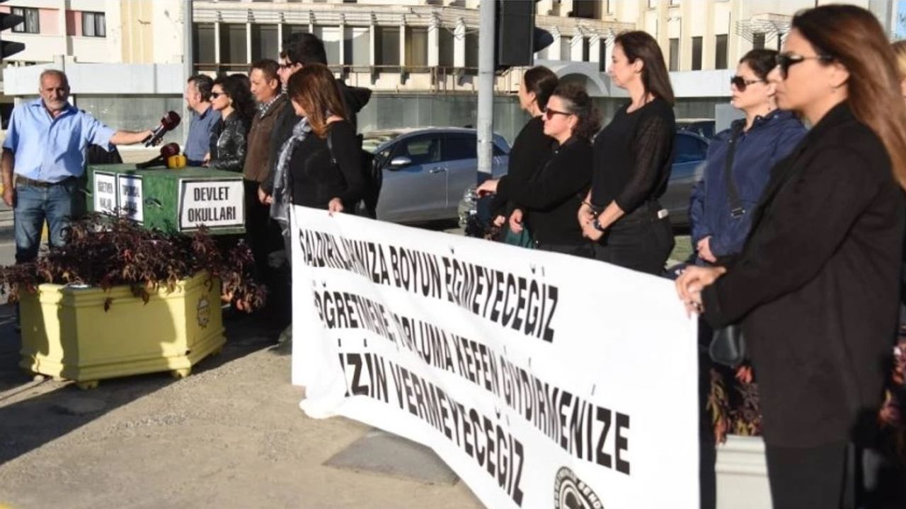 Kıbrıs Türk Orta Eğitim Öğretmenler Sendikası, temsili tabut ve pankartlarla hükümeti istifaya çağırdı. Sendika, eğitimin geri planda bırakılmasına ve öğretmenlere baskıya karşı mücadeleye devam edeceklerini açıkladı. KTOEÖS Başkanı Selma Eylem yaptığı konuşmada, "Eğitimi gömdüler ancak biz mücadelemize edeceğiz" ifadelerini kullandı.