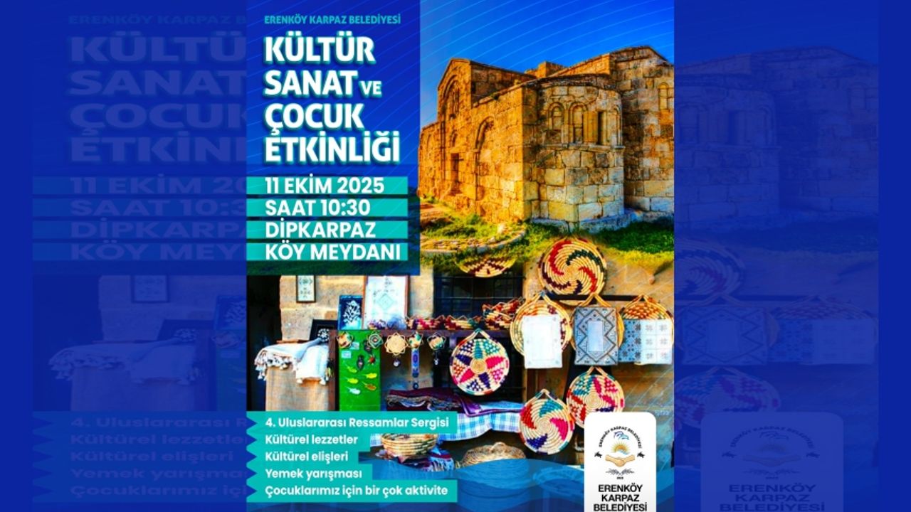 Belediyemiz tarafından organize edilen “Kültür-Sanat ve Çocuk Etkinliği”, 11 Ekim 2025 Cumartesi günü, Dipkarpaz Köyü Meydanı’nda gerçekleştirilecektir. Etkinlik saat 10:30'da başlayacaktır. Etkinlik kapsamında, Kıbrıs’a özgü el işleri, yiyecekler ve çeşitli ürünlerin yer alacağı stantlar kurulacak; bu ürünlerin sergilenmesi ve satışa sunulması planlanmaktadır. Ayrıca çocuklar için oyun parkları, çeşitli turnuvalar ve aktivitelerin yanı sıra bir hamur işi ve tatlı kategorilerinde Yemek Yarışması da düzenlenecektir.