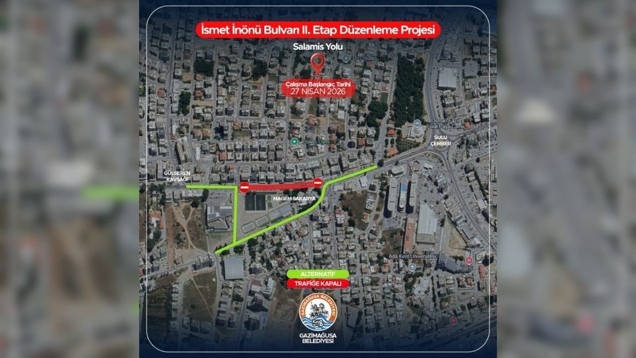 Gazimağusa Belediyesi’nden verilen bilgiye göre, söz konusu yol, İsmet İnönü Bulvarı (Salamis Yolu) 2. Etap Düzenleme Projesi kapsamında yürütülen altyapı ve kaldırım çalışmaları nedeniyle geçici olarak kapatılacak.