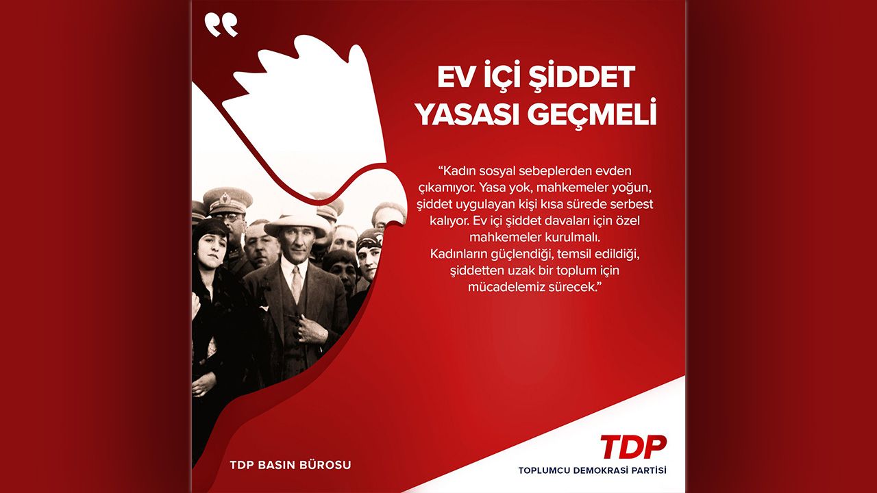 “Kadın, sosyal sebeplerden evden çıkamıyor. Yasa yok, mahkemeler yoğun, şiddet uygulayan kişi kısa sürede serbest kalıyor. Ev içi şiddet davaları için özel mahkemeler kurulmalı.” TDP, Meclis’e girmesi halinde ilk iş olarak Ev İçi Şiddet Yasası’nı yürürlüğe koyacağını açıkladı.