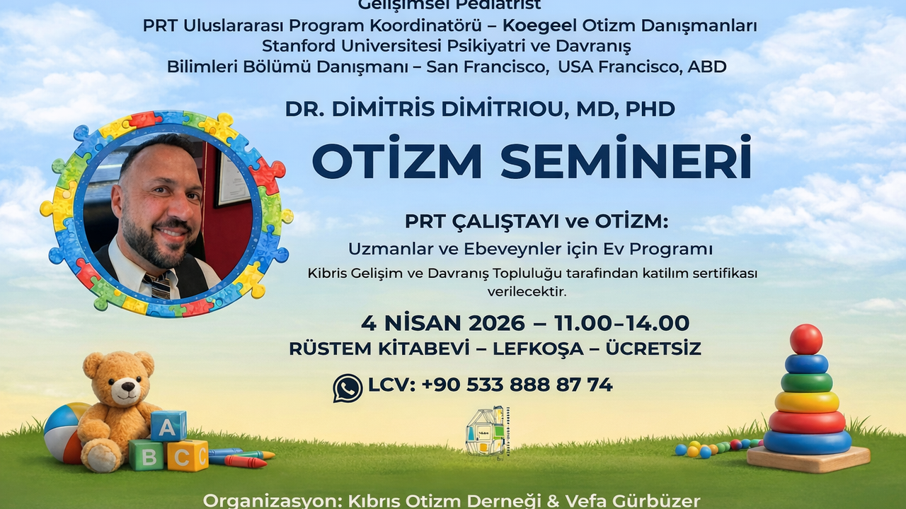Kıbrıs Otizm Derneği ve Vefa Gürbüzer iş birliğiyle, 2 Nisan Otizm Farkındalık Günü dolayısıyla, uzman Dr. Dimitris Dimitriou’nun katılımıyla “Temel Tepki Öğretimi (PRT)” tedavi yöntemi üzerine bir seminer düzenlenecek.