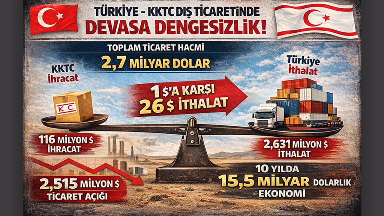 Gıynık Gazetesi’nden Artun Çağa’nın derlediği verilere göre, KKTC, 2025 yılında Türkiye’ye yalnızca 116 milyon 363 bin dolarlık mal satarken, Türkiye’den 2 milyar 631 milyon 650 bin dolarlık mal aldı. Bu tabloyla iki ülke arasındaki toplam ticaret hacmi 2 milyar 748 milyon 13 bin dolara ulaştı ve tüm zamanların en yüksek seviyesine çıktı. TÜİK verilerine göre, 2025 yılı hem ticaret hacmi hem ithalat hem de ticaret açığı bakımından rekorların kırıldığı bir yıl oldu.