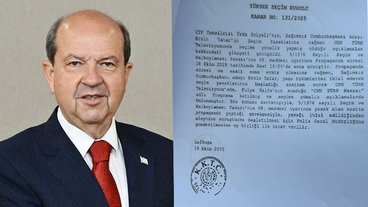 YSK’nın 131/2025 sayılı kararında, 5/1976 sayılı Seçim ve Halkoylaması Yasası’nın 68’inci maddesi uyarınca propaganda süresinin 18 Ekim 2025 saat 18.00’de sona erdiği hatırlatılarak, Tatar’ın bu sürenin bitimine rağmen seçim yasaklarının başladığı saatten sonra CNN Türk televizyonunda yayımlanan, Fulya Kalfa’nın sunduğu “CNN Türk Masası” adlı programa katıldığı ve seçime yönelik açıklamalarda bulunduğu belirtildi.